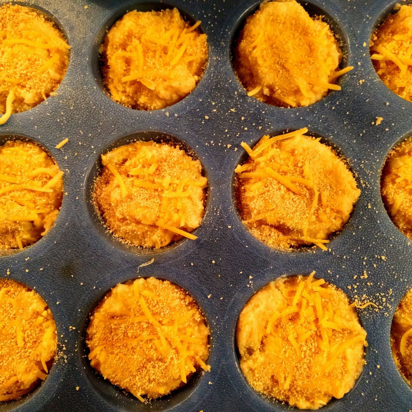 Nu kun je de muffinvormpjes voor 3/4 vullen. Strooit er nog wat geraspte kaas en paneermeel overheen.