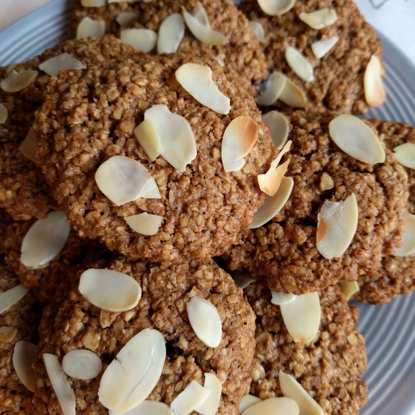 Voeg alle ingrediënten samen in een kom en meng dit met de hand tot je een mooi deeg hebt. Leg nu bakpapier op de bakplaat. Verdeel het deeg in 12 hoopjes. Rol ieder hoopje tot een bal en druk deze vervolgens plat tot een mooi formaat. Druk nu op ieder koekje wat amandelschaafsel. Bak de koekjes op 175 graden gedurende 15 minuten gaar en bruin. Laat ze vervolgens afkoelen. Wel luchtdicht bewaren anders worden de koekjes taai.