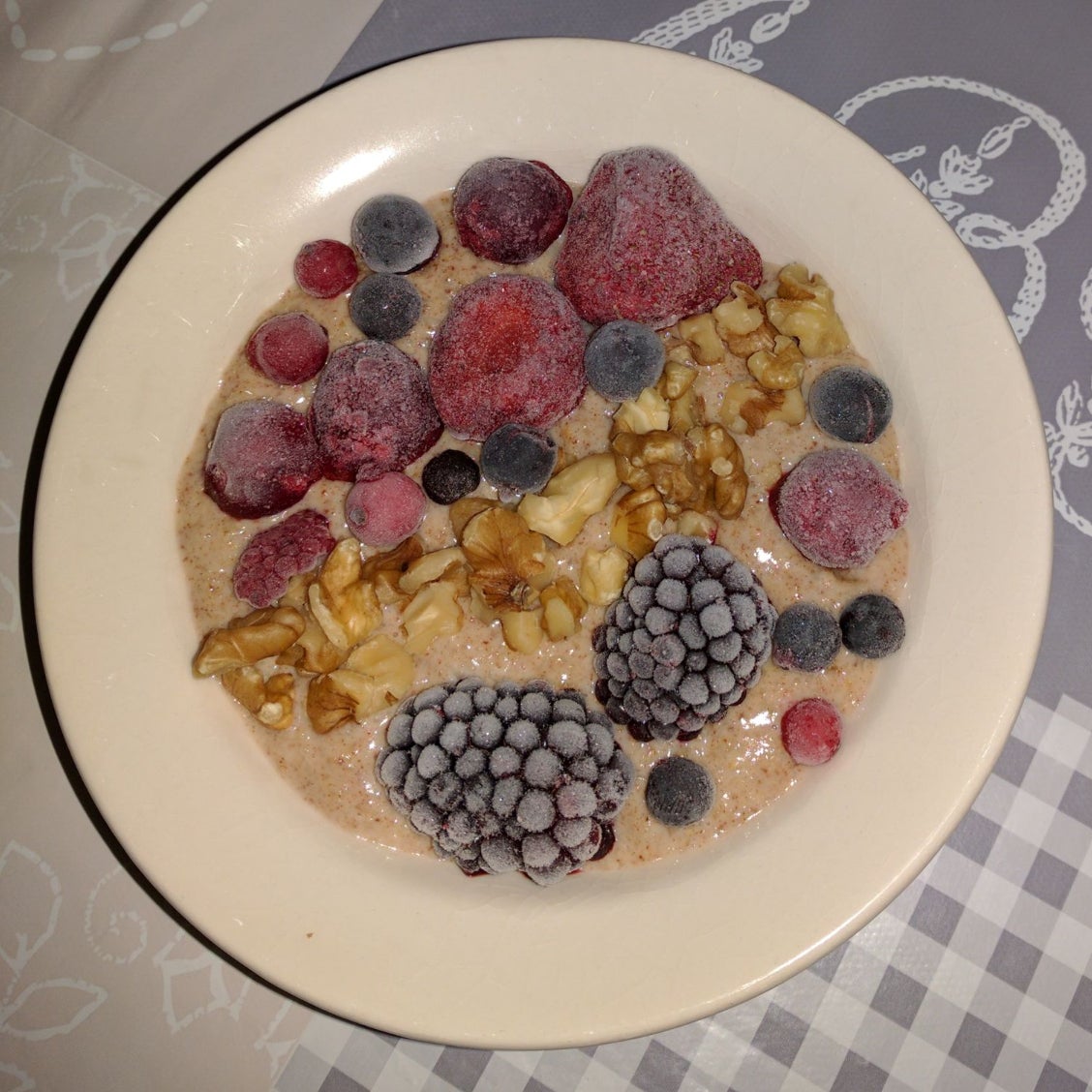 Na ongeveer een kwartier is de havermoutpap klaar en kun je de fijngehakte walnoten en het rood fruit toevoegen.