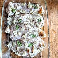 Je doet de kipfilets in een kom en voegt daar 1 eetlepel olijfolie, de plakjes knoflook, citroensap, laurierblad, rozemarijn en zout en peper aan toe. Goed omscheppen en afgedekt in de koelkast zetten (minimaal een uur). Af en toe even omscheppen.