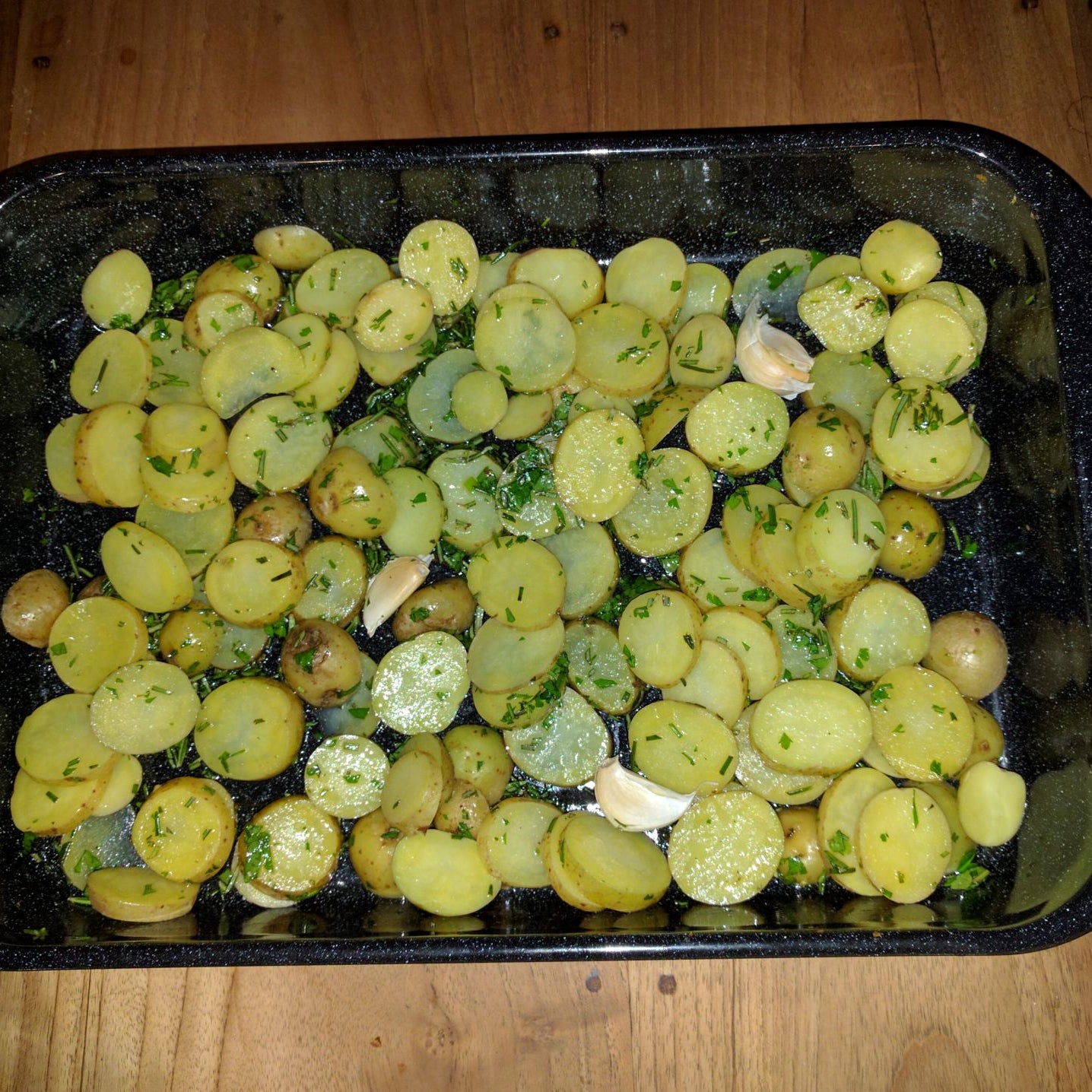 Doe de aardappelschijfjes in een braadslee en giet de olijfolie er overeen. Leg de geplette teentjes knoflook in de schil er tussen.