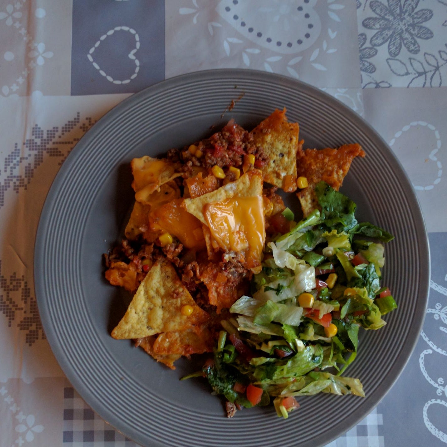 Vervolgens het gehaktmengsel over de bodem van een ovenschaal verdelen. Voeg de tortillachips toe zodat dit mooi het gehakt bedekt. Als laatste kunnen de plakjes cheddarkaas er overheen.