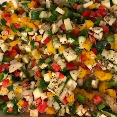 Snijd de ui, courgette en paprika's in kleine blokjes en verdeel de groente en de kip/spekblokjes in een ovenschaal. Breng dit op smaak met Italiaanse kruiden, peper en zout.