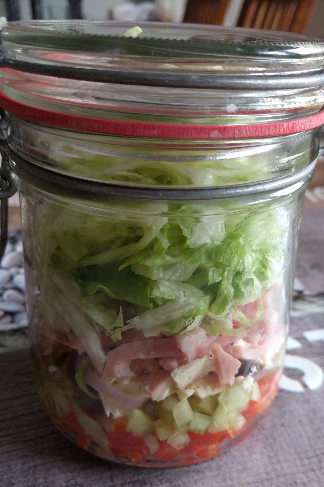 Nu snij je de paprika, ui, komkommer en augurk in kleine stukjes en schep ze op de dressing. Niet doorroeren. Doe nu de hamblokjes, olijven en fetakaas erbij en vul de pot tot de rand met ijsbergsla.