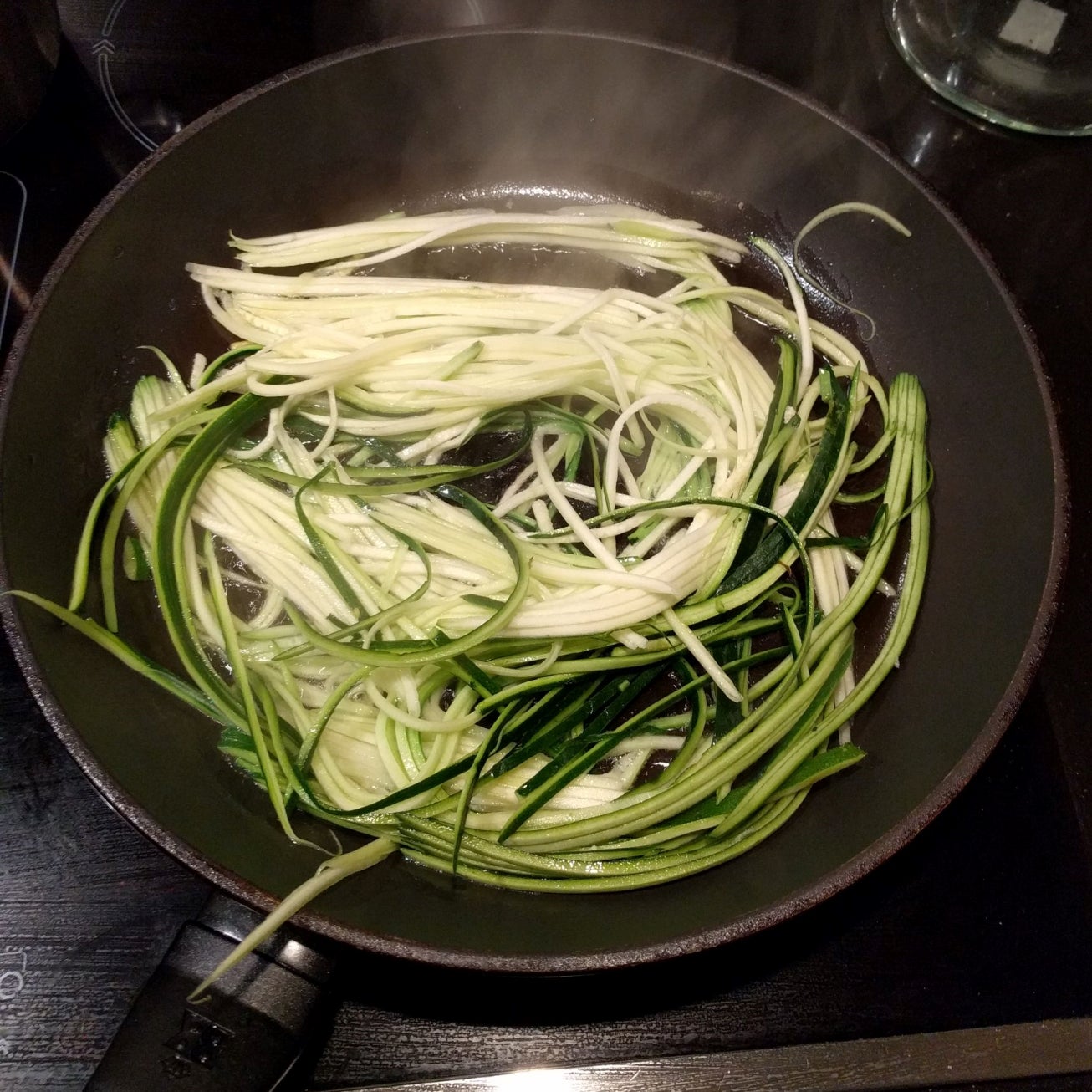 Snijd nu de courgette. Ik gebruik hiervoor een speciale dunschiller (tip: Blokker, ongeveer € 4,-). Snijd de schil ook mee, hier zitten namelijk de meeste vitaminen in.