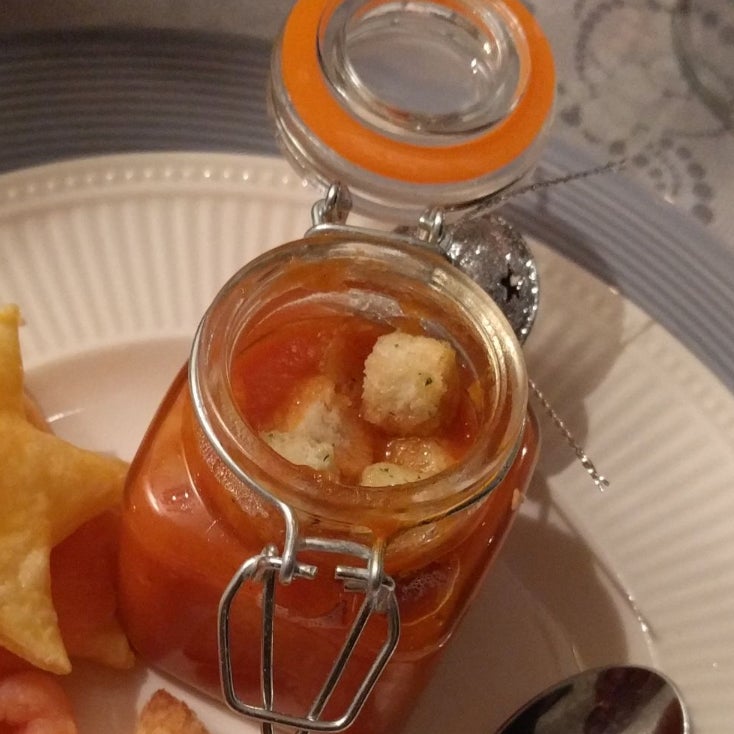 Schenk de soep in een bord of zoals op de foto in een mini weckpotje en serveer met een beetje kookroom en croutons.
