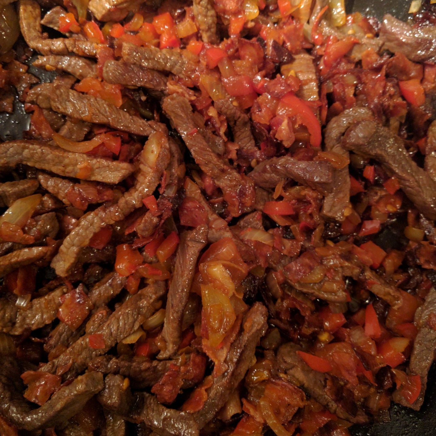 Pak nu een koekenpan en doe er een scheut olijfolie in. Laat dit goed heet worden en bak de biefstuk bruin. Schep nu de biefstukreepjes door de chorizosaus. Je kunt eventueel nog peper en zout toevoegen om het geheel wat pittiger te maken.